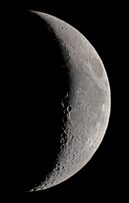 三日月形の月は,欠け際付近のクレーターが,とてもコントラスト良くシャープに見えます。天体望遠鏡で倍率を上げてもらって,その欠け際を上(北)から下(南)へ,詳しく観察してみてください。クレーターの内部や輪郭など,迫力ある様子を見ることができると思います。