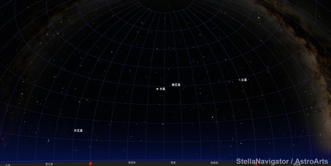 周辺には明るい星がないので、一等星よりもずっと明るいマイナス2.8等級で輝いている木星はとにかく目立ちます。(23時ころには南中します。23時頃には南の空で輝いています)
