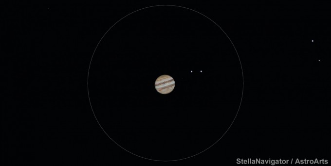 口径4㎝から5㎝の小型屈折望遠鏡、倍率35倍程度で見たときのイメージです。実際には視野内に衛星が何個か見えますが、日時によって衛星の位置は大きく異なりますので図ではあえて非表示にしています。