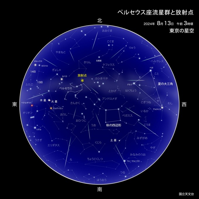 三大流星群の一つであるペルセウス座流星群が見ごろを迎えます。2024年のペルセウス座流星群の活動(注1)は、8月12日23時頃に極大(注2)となることが予想されています。このため、12日深夜から13日未明にかけて、多くの流星が見られそうです。