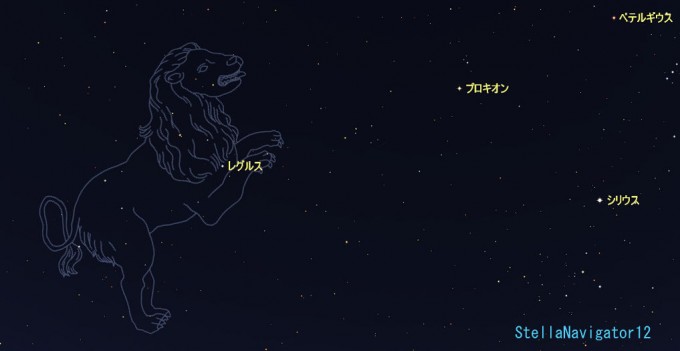 冬の大三角の一番左の一等星プロキオンから,左(東)方向を見ると春の代表的な星座のひとつであるしし座があります。
