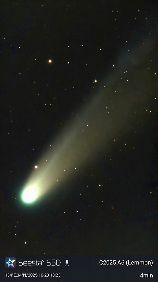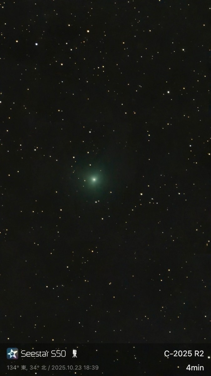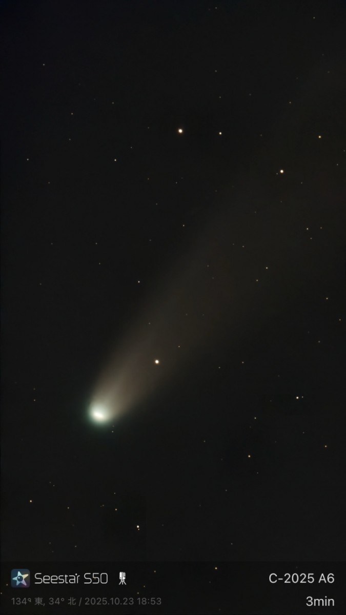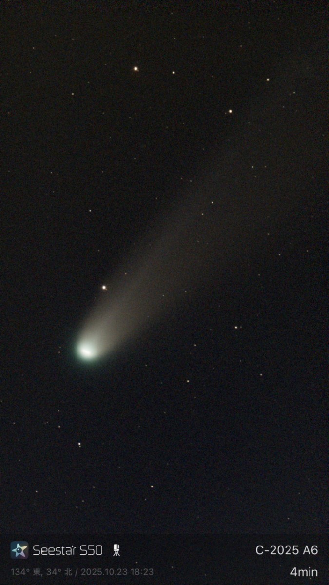 撮影者コメント:双眼鏡では存在ははっきりわかりました。目をそらすと尾もわずかにみえたような、という感じでした。SeestarS50では綺麗に写りました。18時23分と18時53分の写真を比べると、彗星が左に移動しているのがわかるかと思います。コンデジではなんとか存在がわかるというところでした。