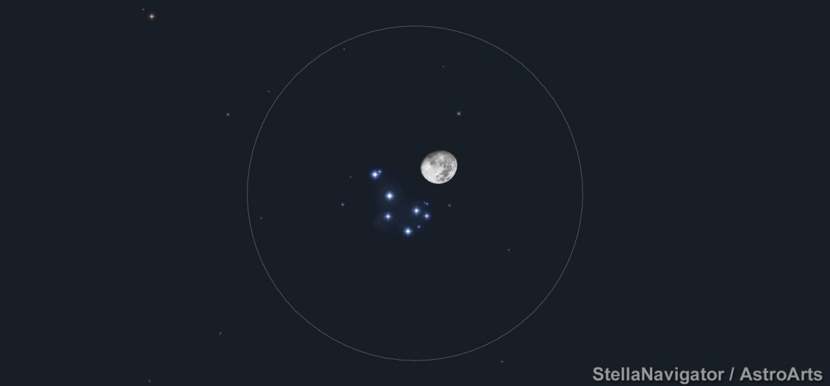 月齢12の半月よりも少し大きな月が目立っています。月の明るさでわかりにくいのですが、おうし座の散開星団すばる(プレヤデス星団)がすぐそばにあります。双眼鏡を使うと見やすいでしょう。視野7度の双眼鏡で見たときのイメージです。