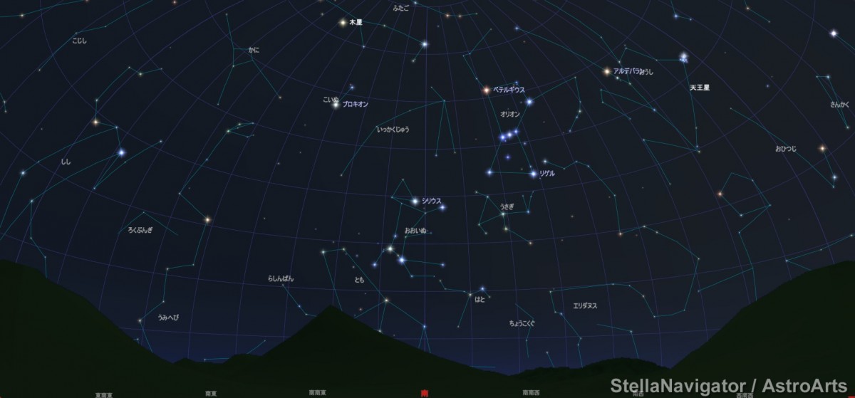 南の空はオリオン座、おおいぬ座、こいぬ座が月明かり中でも見えます。
