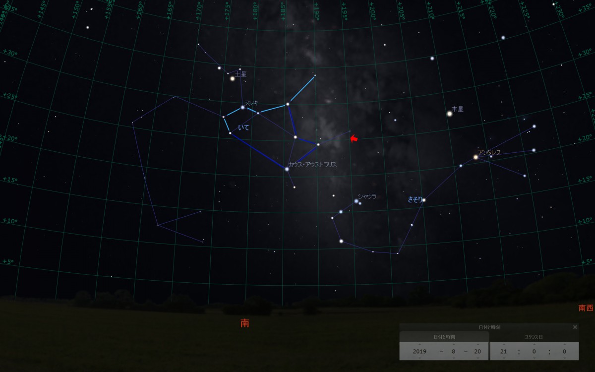 いて座の右側、ぐー・チョキ・パーのグー2つ分くらいのところには、ひときわ明るい木星と、その下、赤い色が美しい、さそり座の一等星はアンタレスが輝いています。アンタレスは小学校でも学習しますので、お子さんやお孫さんと一緒に、この夏の星空をお楽しみになってみてはいかがでしょうか。