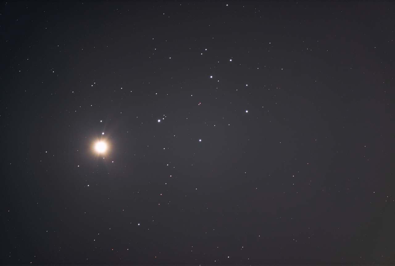 夕方の西の空に金星がとても明るく輝いています。4月上旬はこの金星とすばる(プレヤデス星団)が大接近して見えています。最接近は4月4日ごろで、3日と4日には金星がプレアデス星団に含まれる星のように見えています。すばる(プレヤデス星団)はとても明るい金星と比べると暗いので双眼鏡や、30倍程度の低倍率の天体望遠鏡で見ることをお勧めします。天体望遠鏡工作教室で作った4㎝天体望遠鏡でも充分見えます。倍率5倍程度の双眼鏡では3月28日ごろから4月10日ごろまで、金星とすばるを同一視野で見ることができるでしょう。