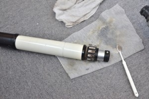 8㎝対物レンズをセルごと取り外してみると、ほぼ全面にカビが発生しています。しかし奥深くまで浸潤しているようではありませんでしたので、すぐに除去することにしました。